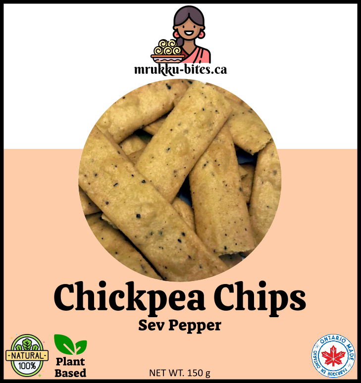 Enjoy the fine taste of Chickpea Chips with Sev Pepper flavour inspired by the South Indian Snack Kara Sev. Kara Sev is made from chickpea or pea flour mixed with spices and deep-fried. We bring the same taste with baking. To know more about the original South Indian dish, check this link: https://en.wikipedia.org/wiki/Sev_(food)